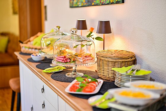 Genießen Sie unser schönes Frühstück mit besten überwiegend regionalen Produkten in entspannter und gemütlicher Atmosphäre. Im Sommer setzen Sie sich auf die angrenzende Terrasse und geniessen Ihr Frühstück im Freien mit Blick auf unseren Garten.